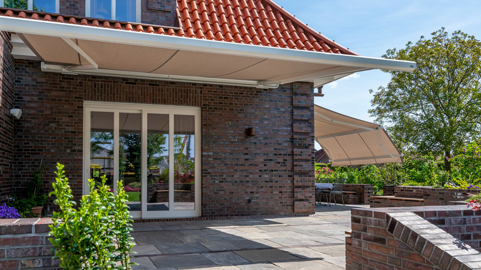 Als Terrassenmarkise wird die Anlage direkt an die Hausfassade montiert und kann dabei auch als „Übereck-Version“ ausgeführt werden. Die Senkrecht und die Horizontalmarkise lassen sich auch unabhängig voneinander ein- und ausgefahren.
