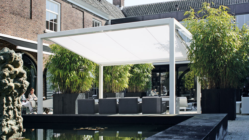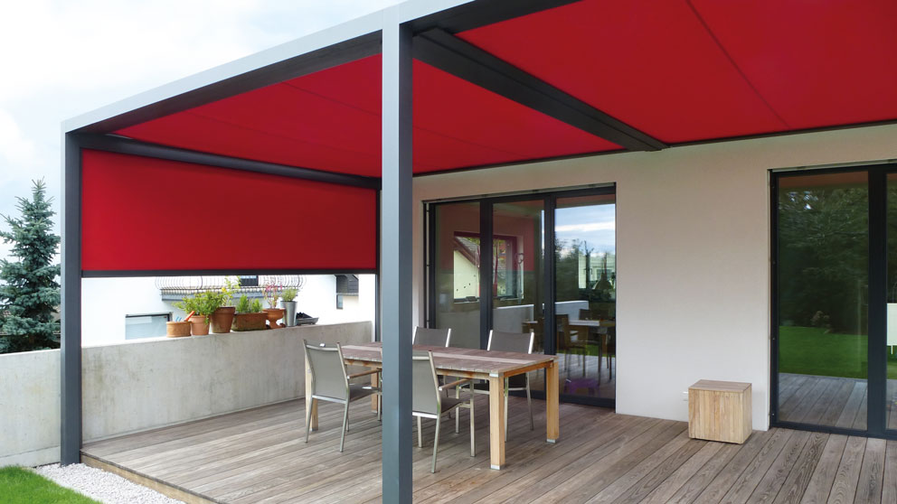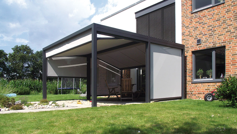 Die kubische Grundform des Q.bus®-Systems ermöglicht die Erweiterung zu einer Art textilen Wintergarten. Aufgrund der rechtwinkligen Seiten- und Frontbereiche können hier zusätzliche Senkrechtanlagen montiert werden.