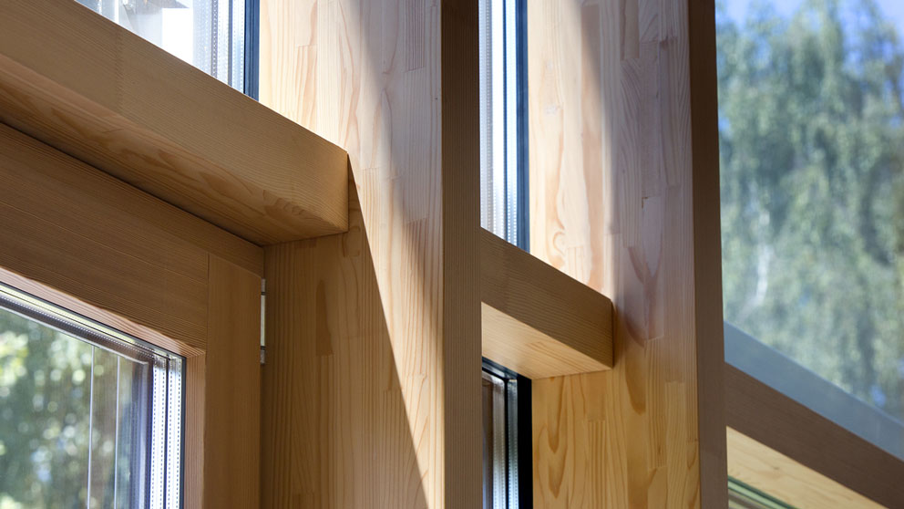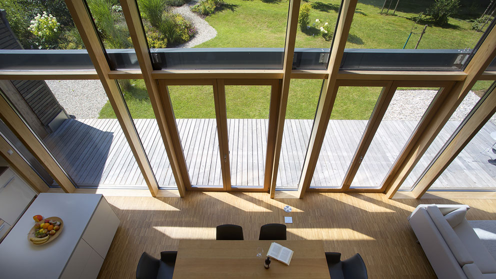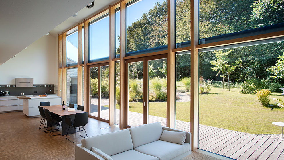Der natürliche Baustoff Holz sorgt im Inneren für eine wohlige Atmosphäre. Die weichen Farbtöne und die fließenden Strukturen passen perfekt zu klassischen aber auch modernen Wohnstilen. Die seidenglatten Holzoberflächen werden von außen durch eine robuste Aluminium-Schale vor Witterungseinflüssen geschützt. Außerdem verstärkt das exakte und geradlinige Aluminium den eindrucksvollen Effekt und modernen Look großer Glasfassaden.